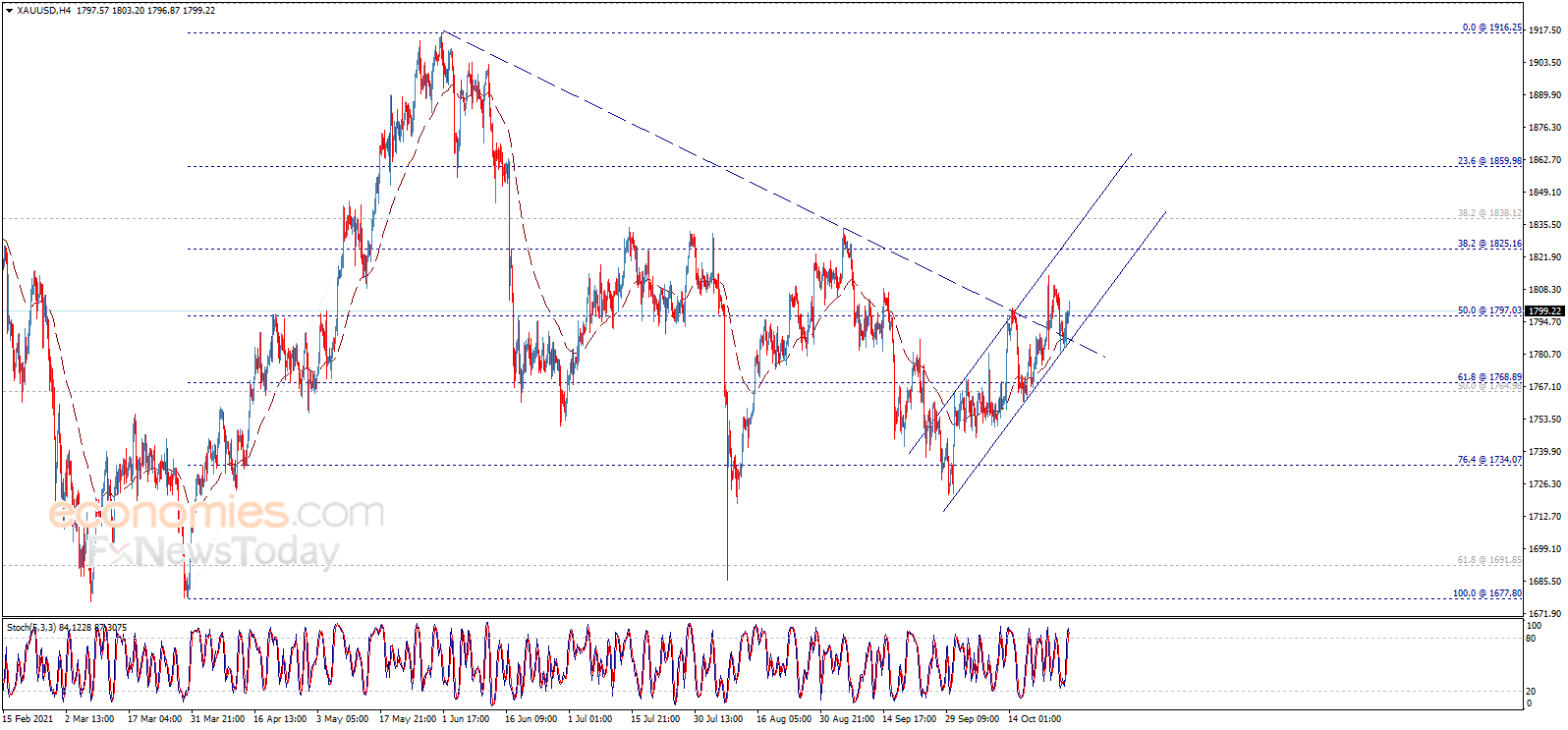 ราคาทองคำซื้อขายในทางบวกเพื่อทะลุระดับ 1797.00 และพยายามที่จะอยู่เหนือระดับนั้น เพื่อเปิดใช้งานสถานการณ์แนวโน้มขาขึ้นบนพื้นฐานระหว่างวัน ซึ่งจัดอยู่ในช่องสัญญาณตลาดกระทิงที่ปรากฏบนแผนภูมิ โดยรอที่จะเข้าสู่ 1825.15 เป็นหลัก