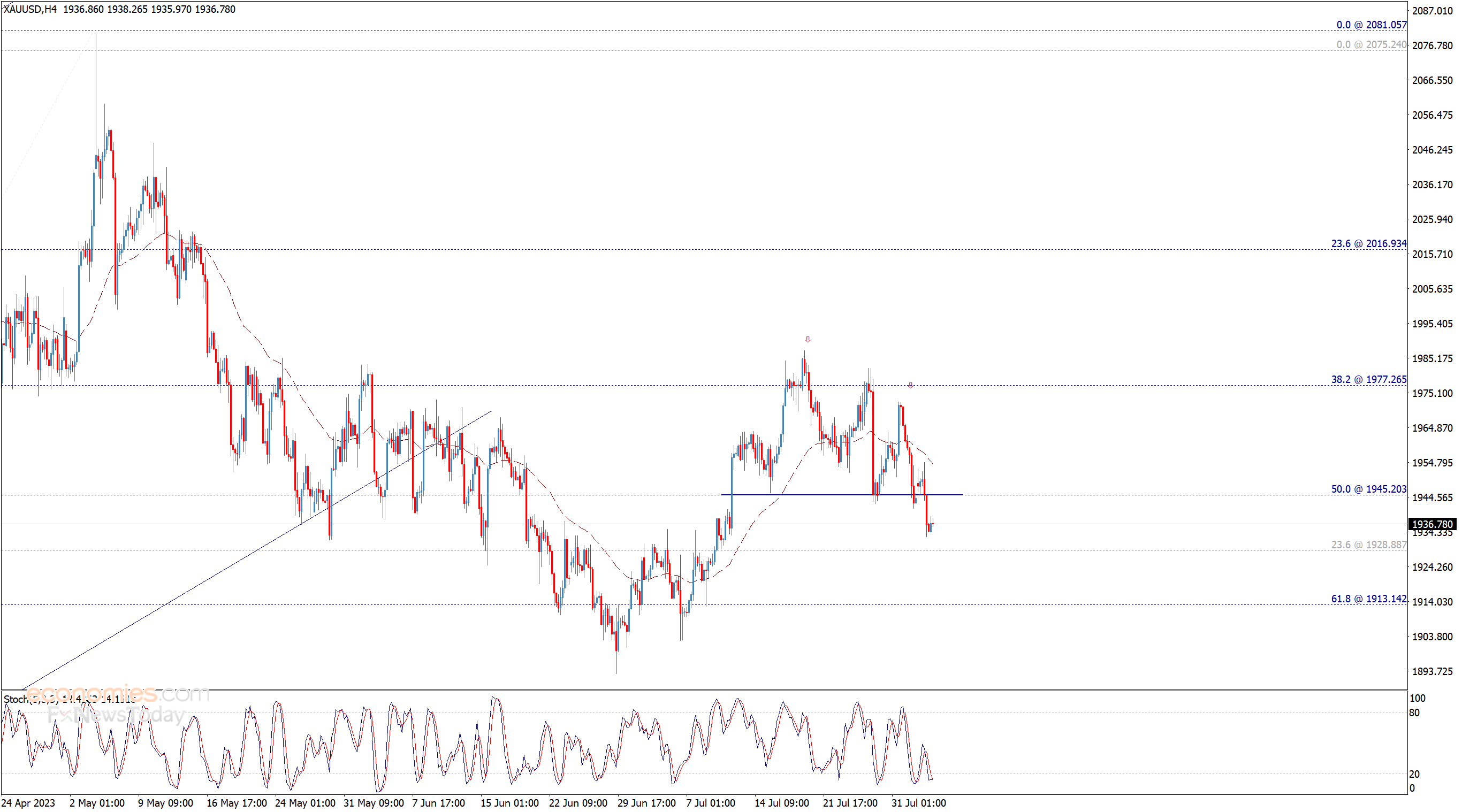 ราคาทองคำพุ่งทะลุ 1945.20 และปิดการซื้อขายเมื่อวานที่ต่ำกว่า ย้อนกลับต่ำกว่าและมุ่งหน้าสู่การปรับฐานที่ลดลงมากขึ้น และเราคาดว่าราคาจะตั้งเป้าไปที่ 1929.00 จากนั้น 1913.15 เป็นเป้าหมายหลักถัดไป