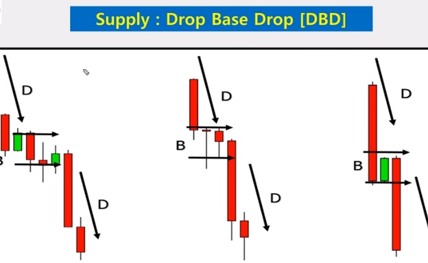 - Drop Base Drop (DBD) เป็นลักษณะของเทรนด์ขาลงที่ราคาวิ่งลง(Drop) แล้วมีการพักตัว (Base) แล้วราคาก็วิ่งลงต่อตามเทรนด์ขาลงเดิม(Drop)