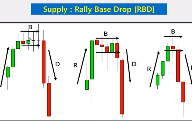 - Rally Base Drop (RBD) เป็นลักษณะเทรนด์ขาขึ้นราคาวิ่งขึ้น(Rally) แล้วมีการพักตัว(Base) แล้วสร้างโซน Supply จากนั้นราคาก็กลับตัววิ่งลง(Drop)