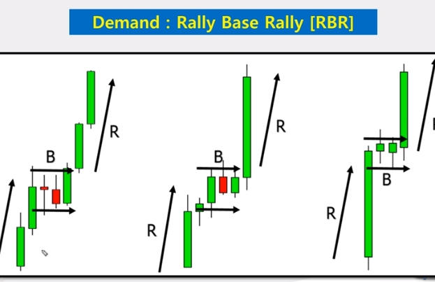 - Rally Base Rally (RBR) เป็นลักษณะของราคาที่เป็นเทรนด์ขาขึ้นราคาวิ่งขึ้น(Rally) แล้วมีการพักตัว(Base) สร้างโซน Demand ไว้ แล้วก็วิ่งขึ้นต่อไปตามเทรนเดิม(Rally)