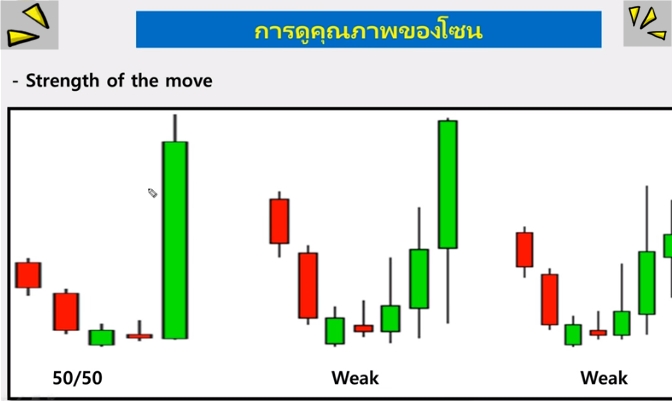 ในการเข้าเทรดตามแนว Demand/Supply ควรพิจารณาว่าโซนนั้นๆเป็น Strong หรือ Weak Zone โดยจะต้องดูจากจำนวนแท่งเทียนและจำนวนครั้งที่ทดสอบโซน