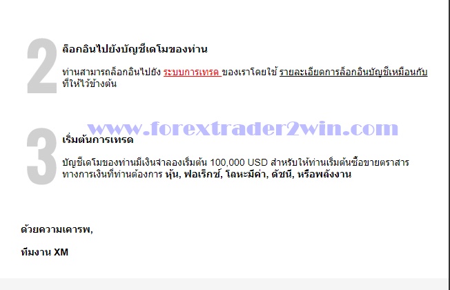 ระบบจะแจ้งข้อมูลดังรูปด้านล่างนี้ ให้ผู้เปิดบัญชีไปเช็คในอีเมล์ที่ใช้สมัครเปิดบัญชีทดลอง XM