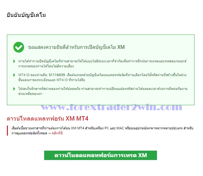 หลังจากยืนยันอีเมล์เสร็จเรียบร้อยแล้วระบบจะแจ้งข้อมูลเลขบัญชีสำหรับเทรดให้ทราบบนเว็บ xm.com ดังรูปด้านล่าง