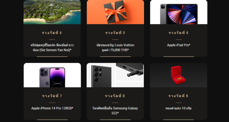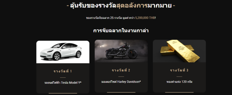 ไม่ว่าจะเป็น รถยนต์ไฟฟ้า Tesla, จักรยานยนต์ Harley Davidson, ทองคำแท่ง 120 กรัม และ อื่นๆอีกมากมาย